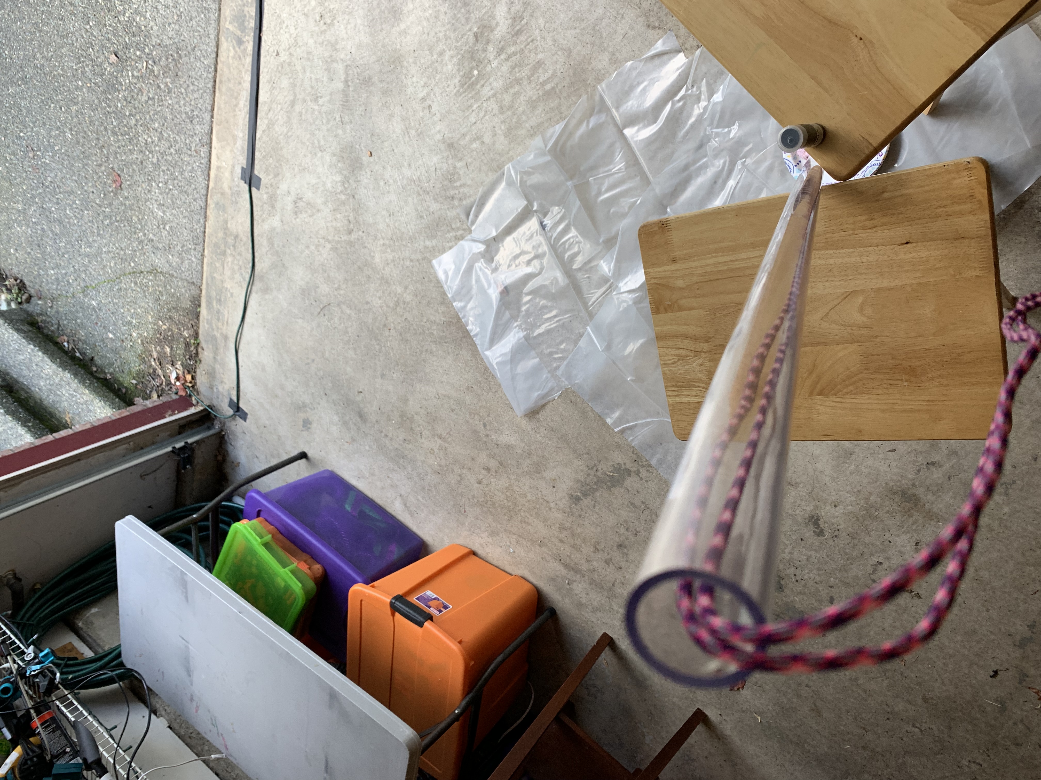 Inside of tube painted with Ikea black acrylic paint. Poured paint down tube and spread by forcing a small sponge through repeatedly, attached with string. Dried by running a pool-floatie air-pump through the tube for a day.